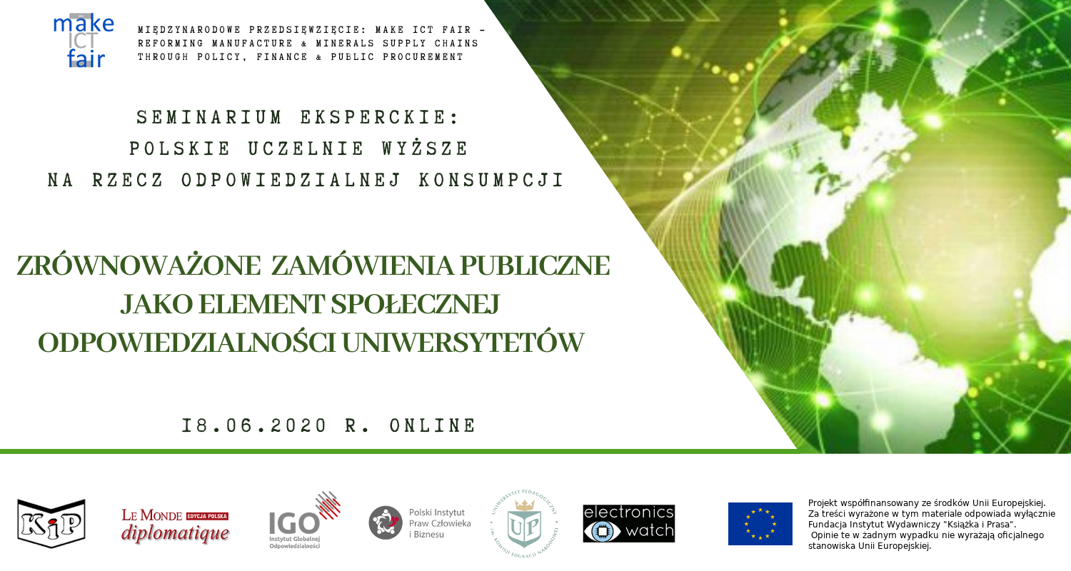 Instytut Wydawniczy „Książka i Prasa” we współpracy z Instytutem Globalnej Odpowiedzialności (IGO) i „Le Monde Diplomatique edycja polska” wraz ze współorganizatorami – Polskim Instytutem Praw Człowieka i Biznesu oraz Uniwersytetem Pedagogicznym im. KEN w Krakowie, Electronics Watch i partnerami – Studenckim Kołem Naukowym Ekonomii Politycznej SGH oraz Kołem Naukowym Instytutu Politologii UP im. KEN zapraszają na seminarium dedykowane problematyce Zrównoważonych Zamówień Publicznych dotyczących elektroniki prowadzonych przez uczelnie wyższe.