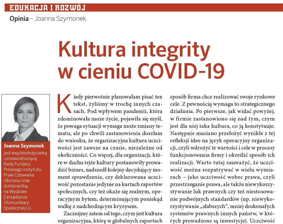 (09.2020) We wrześniowym numerze czasopisma „Personel Plus” ukazał się artykuł autorstwa Joanny Szymonek pt. „Kultura integrity w cieniu COVID-19”.