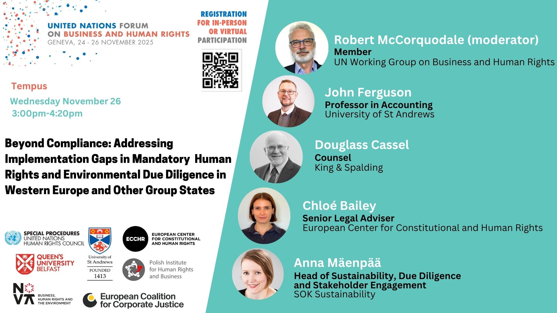 Sesja jest organizowana przez: UN Working Group on Business and Human Rights, Queen’s University Belfast, University of St Andrews, Polski Instytut Praw Człowieka i Biznesu (Polish Institute for Human Rights and Business), European Coalition for Corporate Justice, European Center for Constitutional and Human Rights e.V. (ECCHR) oraz NOVA Centre on Business, Human Rights and the Environment.
