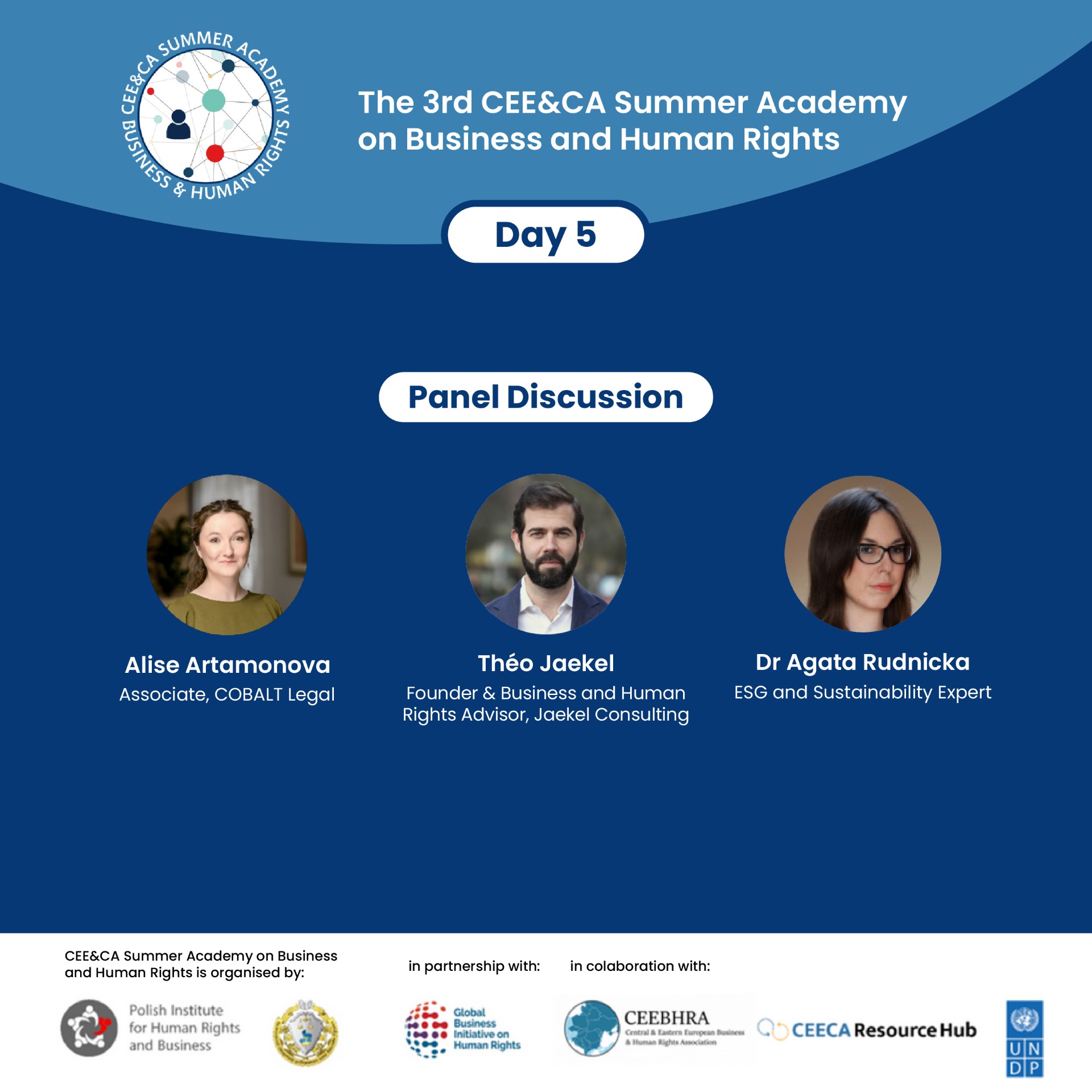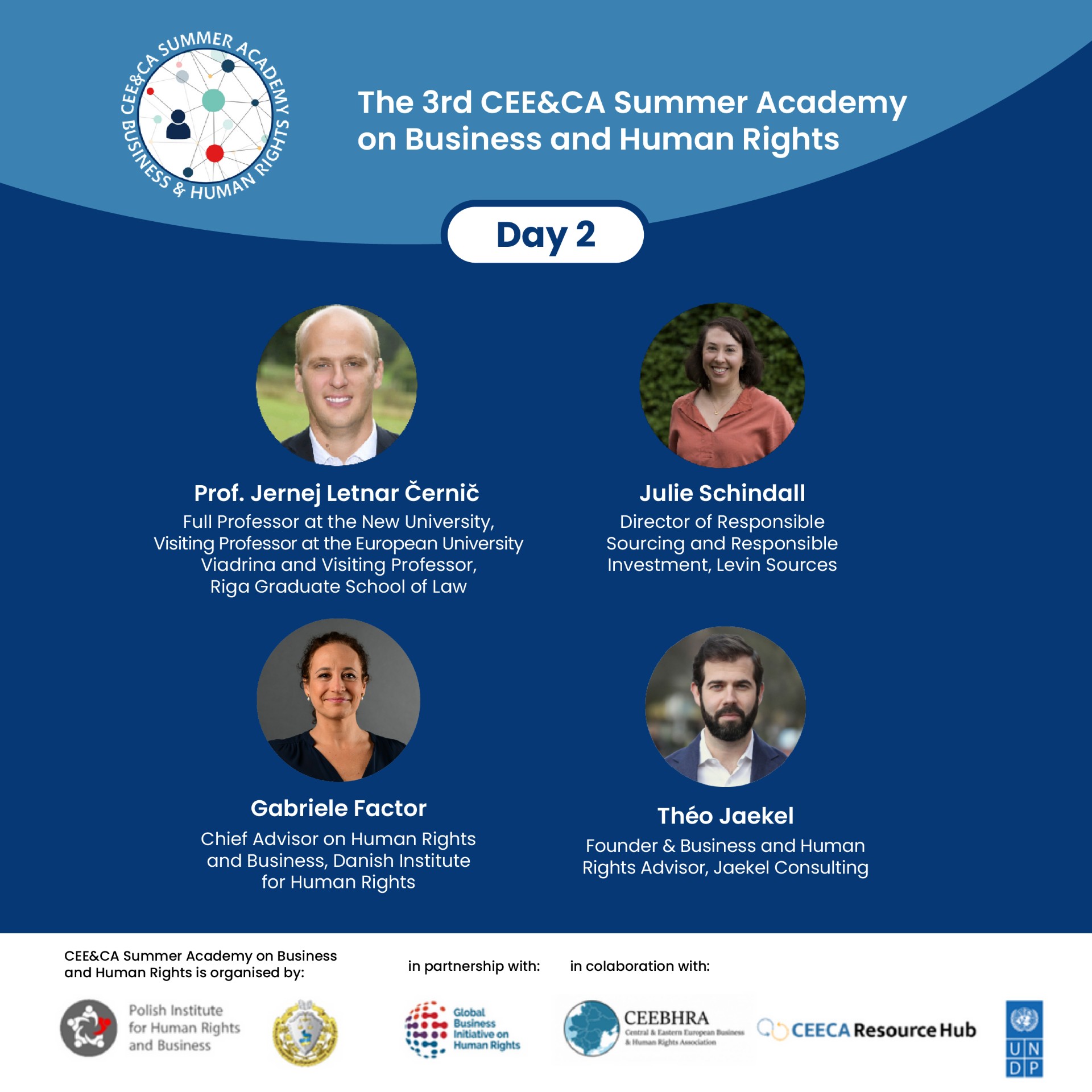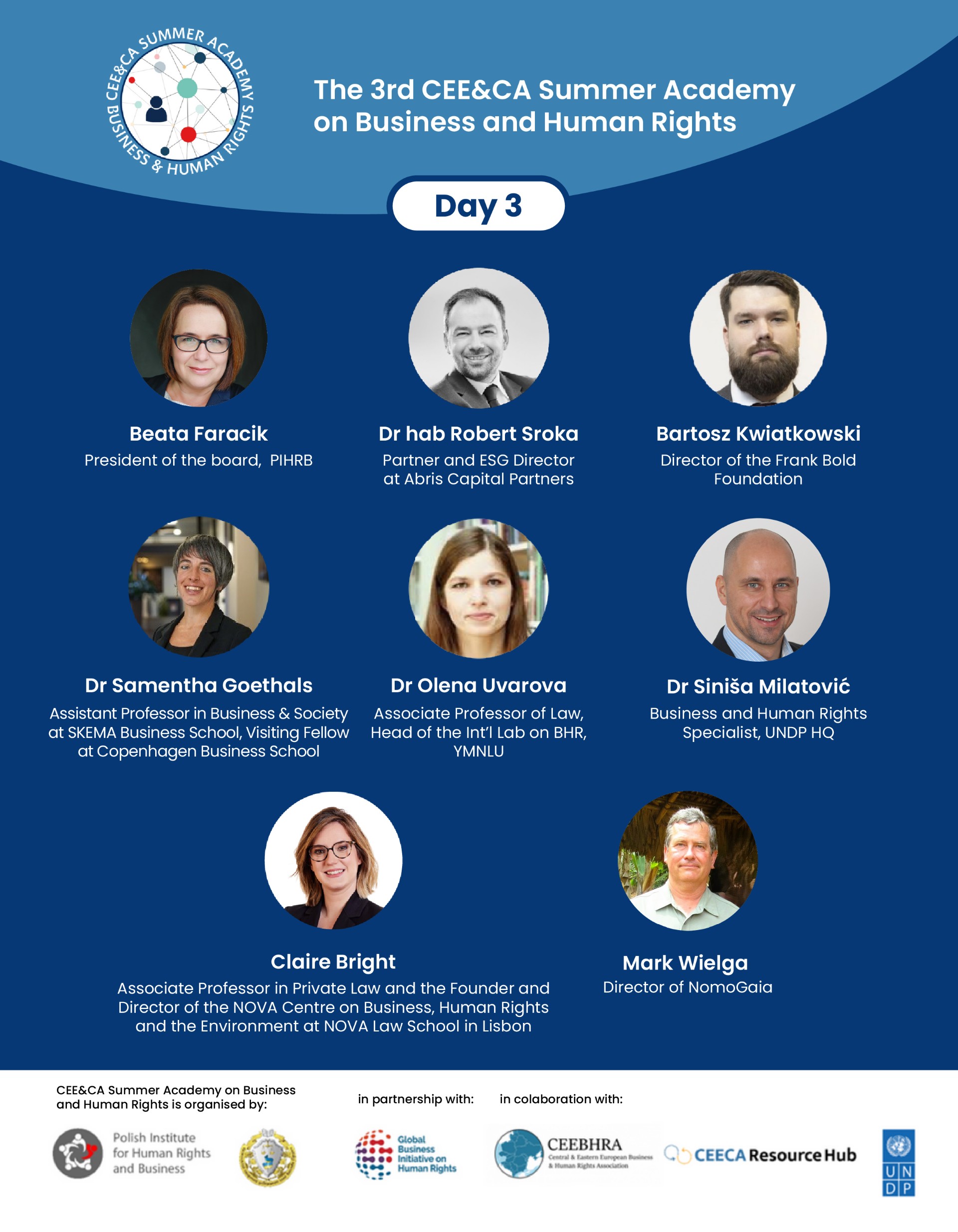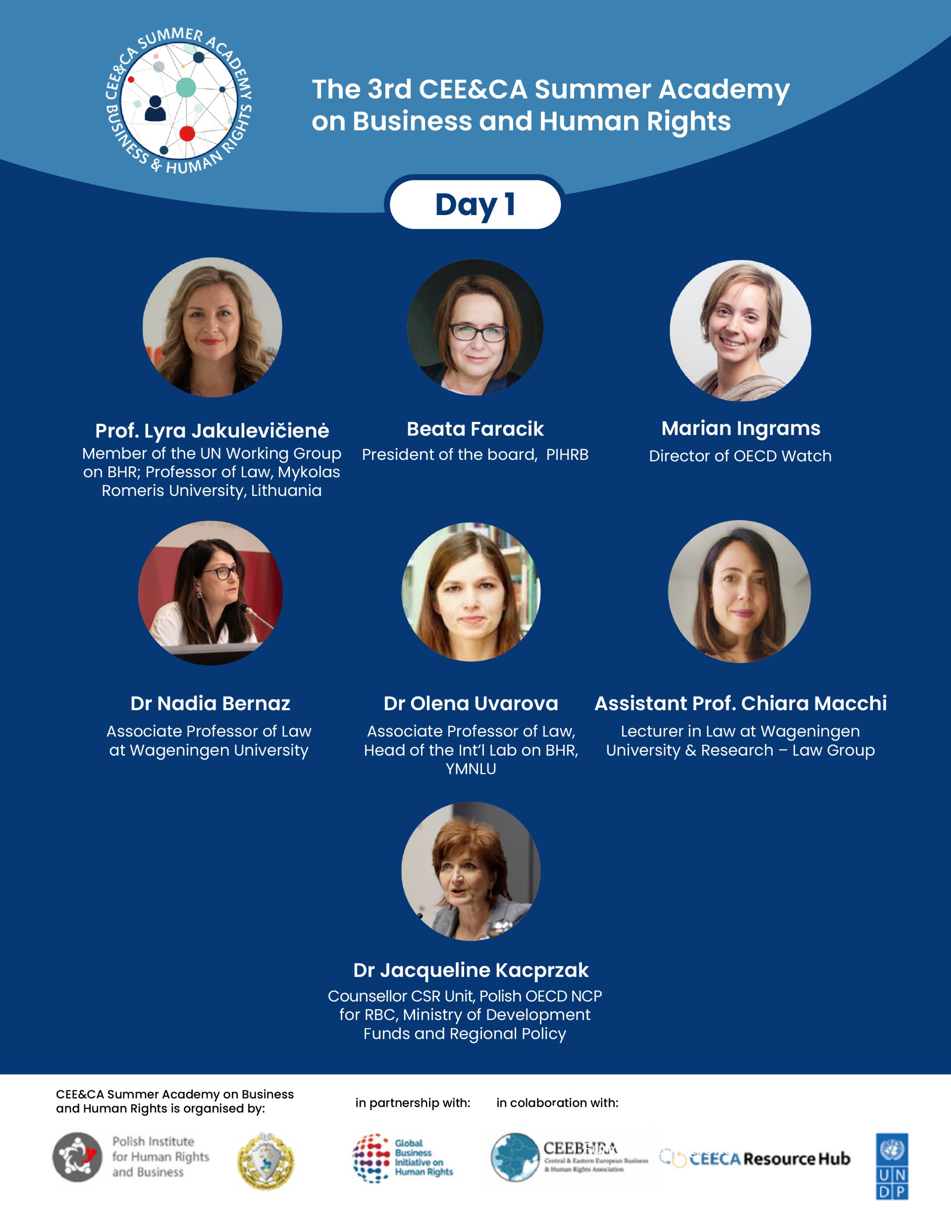 CEE&CA Summer Academy została zorganizowana przez Polski Instytut Praw Człowieka i Biznesu (PIHRB) oraz Narodowy Uniwersytet Prawa im. Jarosława Mądrego (Ukraina), we współpracy z Global Business Initiative on Human Rights (GBI), UNDP, CEECA Resource Hub oraz CEE&CA BHR Association. Organizacje te wspierają Akademię od samego początku, wzmacniając jej rangę i oddziaływanie w regionie.